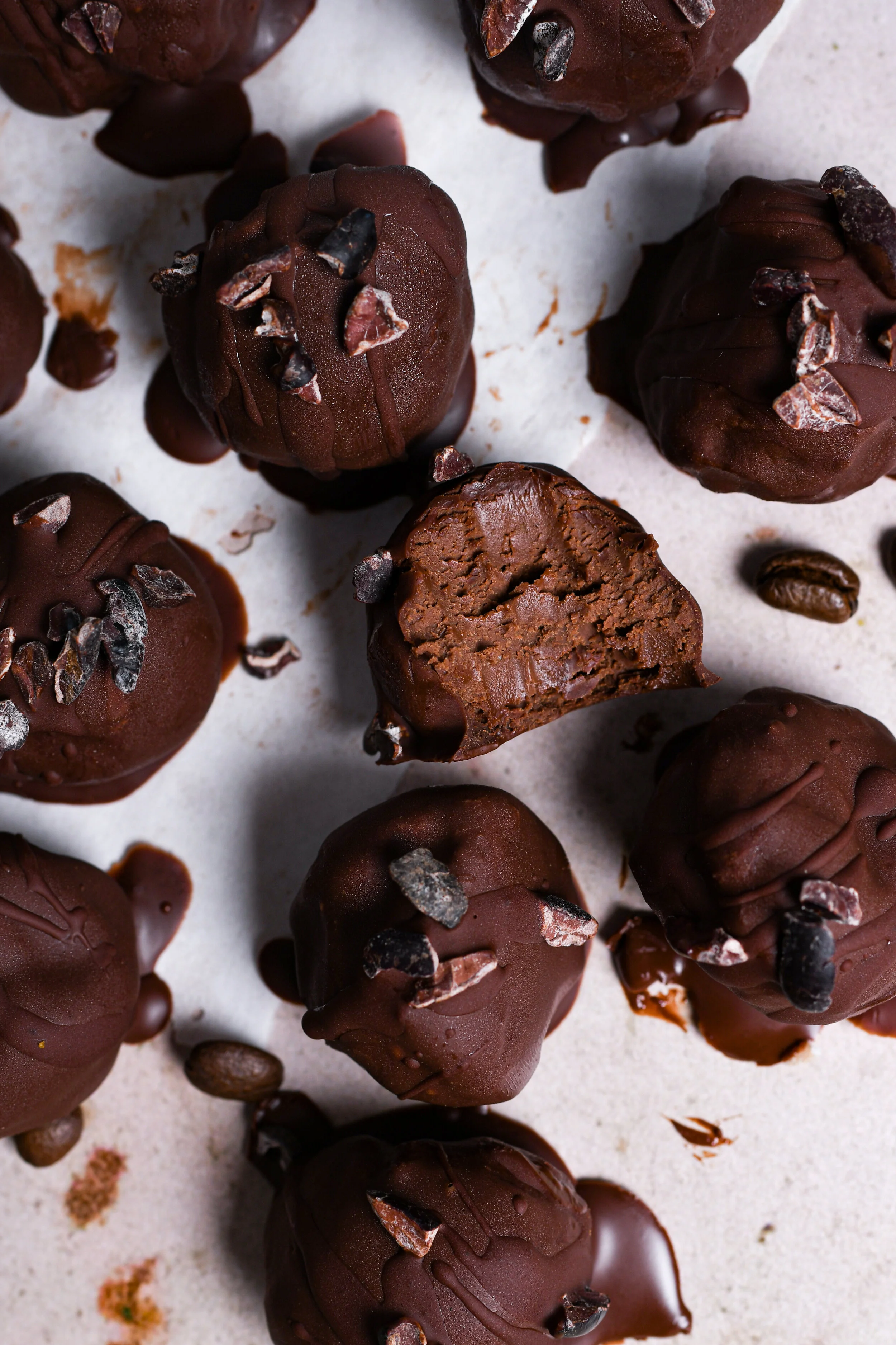 Magiskt goda tryfflar med en hint av kaffe som fullkomligt smälter i munnen! Dessa är helt veganska, glutenfria och bakade utan raffinerat socker. Dom passar många helt enkelt!