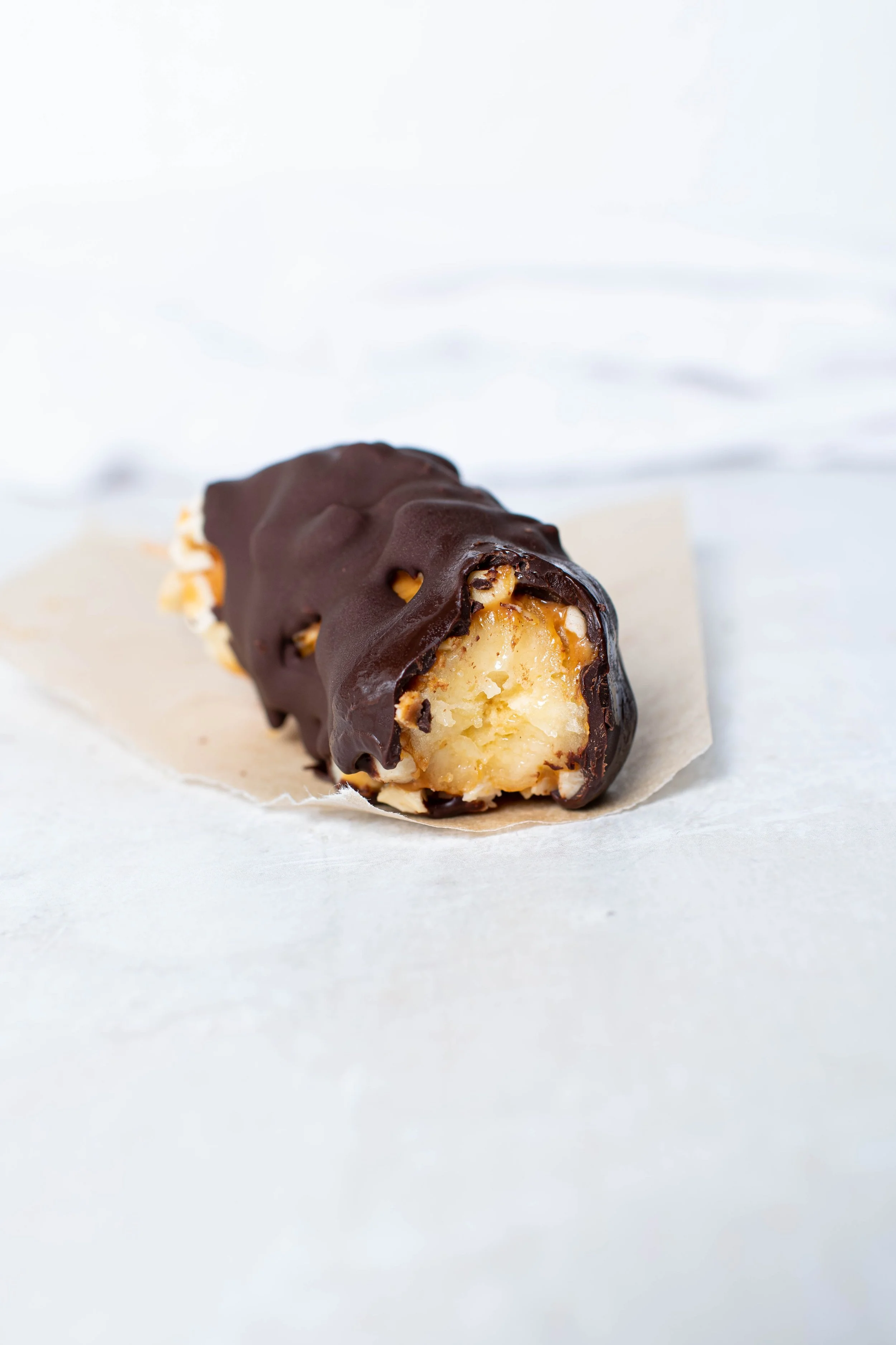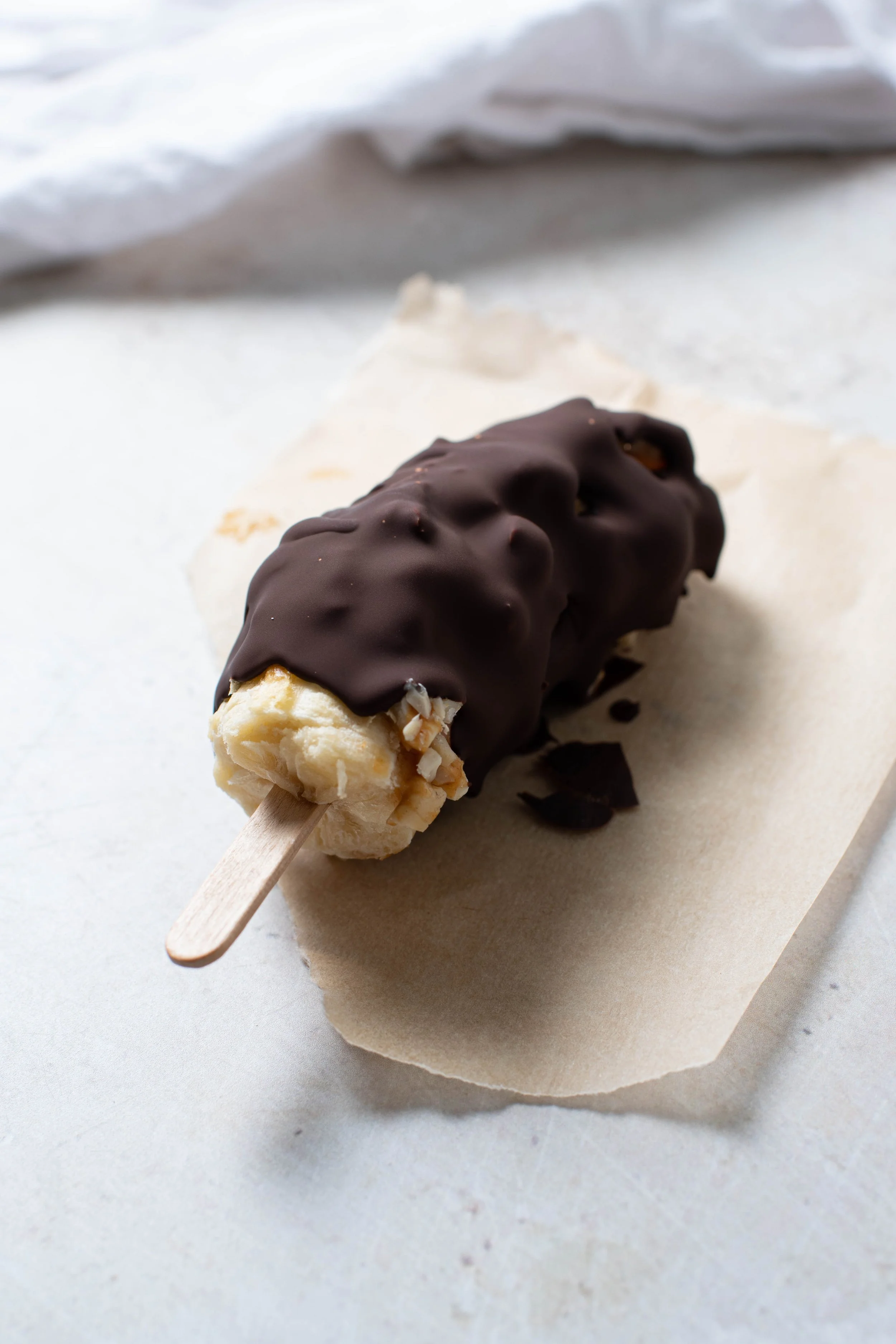 Ringla choklad över bananglassen. Lägg på bakplåtspapper och låt stelna i frysen.